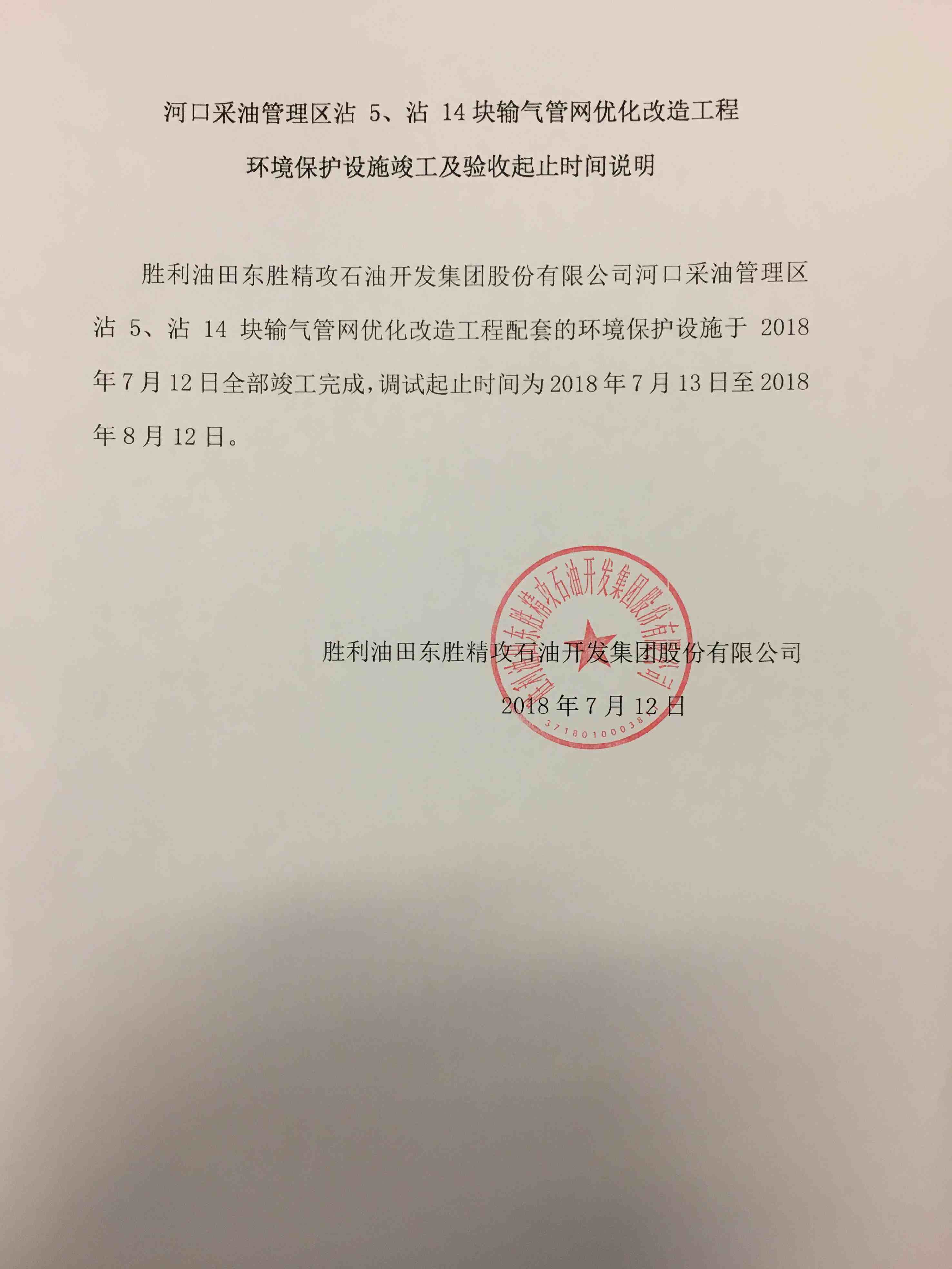 河口采油管理區(qū)沾5、沾14塊輸氣管網(wǎng)優(yōu)化改造工程環(huán)境保護設施竣工及驗收起止時間說明