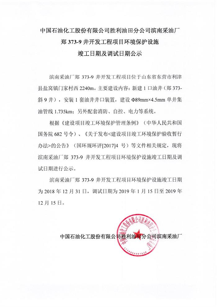 中國石油化工股份有限公司勝利油田分公司濱南采油廠鄭373-9井開發(fā)工程項目環(huán)境保護設施竣工日期及調(diào)試日期公示