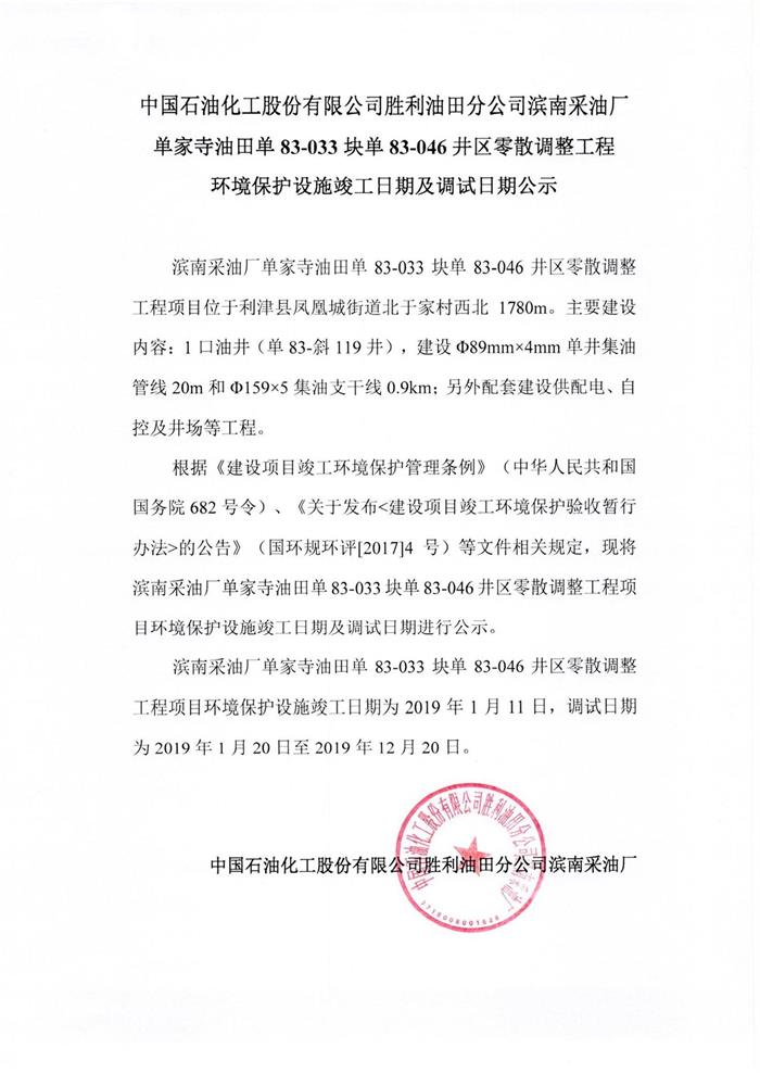 中國石油化工股份有限公司勝利油田分公司濱南采油廠單家寺油田單83-033塊83-046井區(qū)零散調整工程環(huán)境保護設施竣工日期及調試日期公示