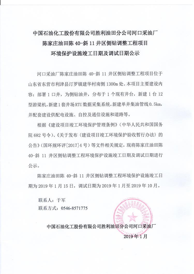 中國石油化工股份有限公司勝利油田分公司河口采油廠陳家莊油田陳40-斜11井區(qū)側(cè)鉆調(diào)整工程項(xiàng)目 環(huán)境保護(hù)設(shè)施竣工日期及調(diào)試日期公示