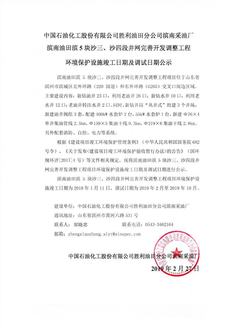 中國(guó)石油化工股份有限公司勝利油田分公司濱南采油廠濱5塊沙三、四段井網(wǎng)完善開發(fā)調(diào)整工程環(huán)境保護(hù)設(shè)施竣工日期及調(diào)試日期公示
