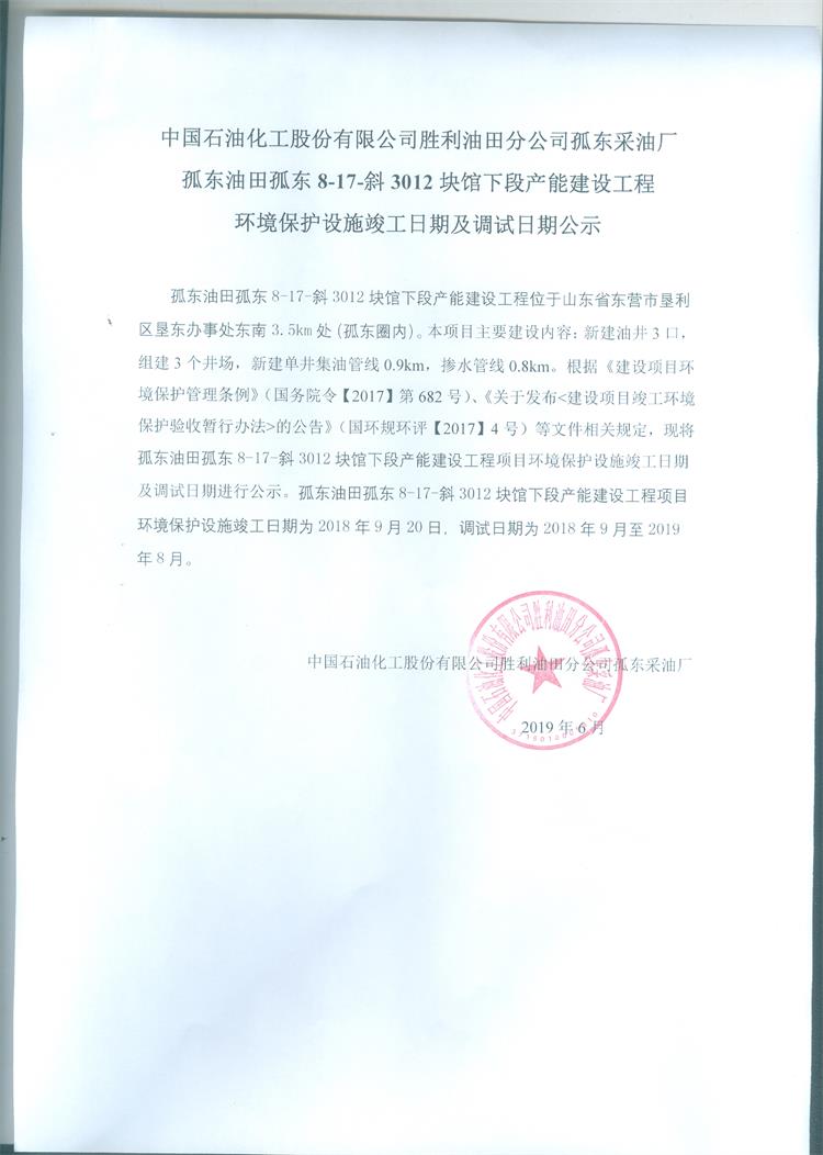 中國(guó)石油化工股份有限公司勝利油田分公司孤東采油廠孤東油田孤東8-17斜3012塊館下段產(chǎn)能建設(shè)工程環(huán)境保護(hù)設(shè)施竣工日期及調(diào)試日期公示